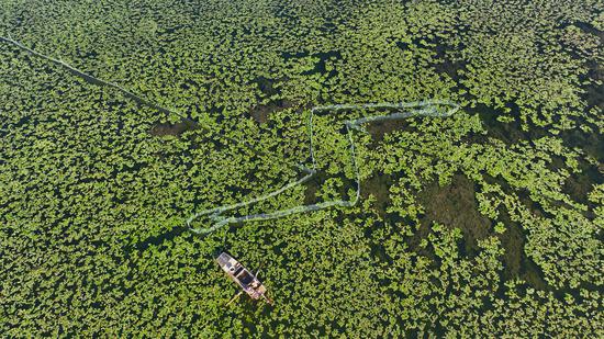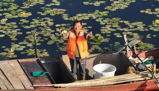 A farmer harvests crabs on Bosten Lake. (Photo/Chinanews.com)