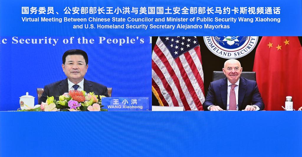 Chinese State Councilor and Minister of Public Security Wang Xiaohong meets with U.S. Department of Homeland Security Secretary Alejandro Mayorkas via video link on Sept. 25, 2024. (Xinhua/Yue Yuewei)