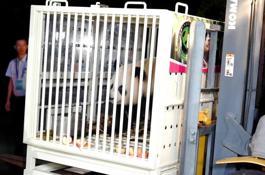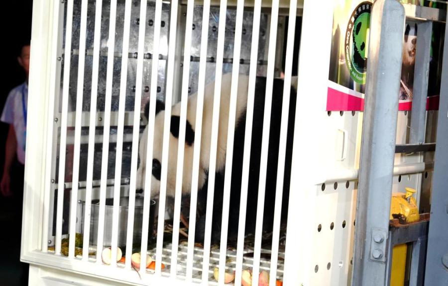 Giant panda An An is seen in a transport cage at the Dujiangyan base of the China Conservation and Research Center for Giant Panda in Dujiangyan, southwest China's Sichuan Province, Sept. 25, 2024. (Photo: China News Service/Li Chuanyou)