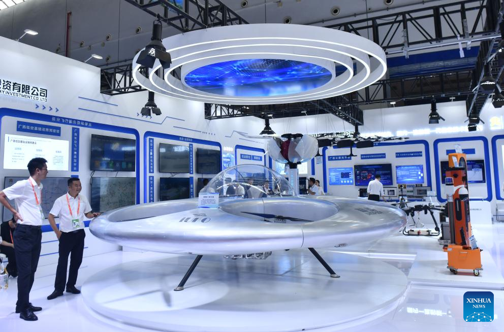 A manned aircraft is on display at the 21st China-ASEAN Expo in Nanning, south China's Guangxi Zhuang Autonomous Region, Sept. 26, 2024. New technologies and applications such as intelligent robots, unmanned vehicles and AI applications are gaining popularity at the ongoing China-ASEAN Expo in Nanning. (Xinhua/Huang Xiaobang)