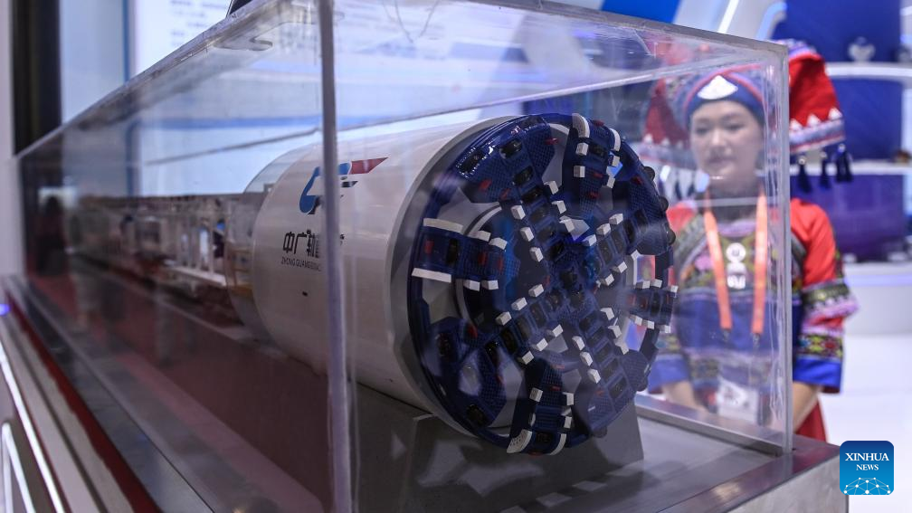 A model of a tunnel boring machine (TBM) is on display at the 21st China-ASEAN Expo in Nanning, south China's Guangxi Zhuang Autonomous Region, Sept. 26, 2024. New technologies and applications such as intelligent robots, unmanned vehicles and AI applications are gaining popularity at the ongoing China-ASEAN Expo in Nanning. (Xinhua/Zhang Ailin)