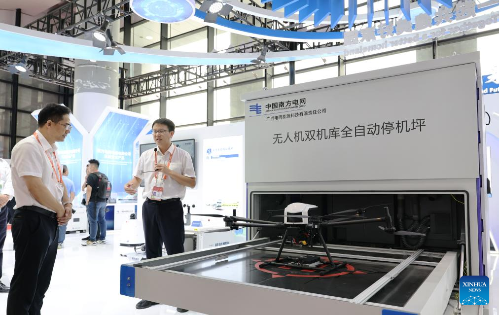 An exhibitor introduces an automatic apron for drones at the booth of China Southern Power Grid during the 21st China-ASEAN Expo in Nanning, south China's Guangxi Zhuang Autonomous Region, Sept. 25, 2024. New technologies and applications such as intelligent robots, unmanned vehicles and AI applications are gaining popularity at the ongoing China-ASEAN Expo in Nanning. (Xinhua/Jin Haoyuan)