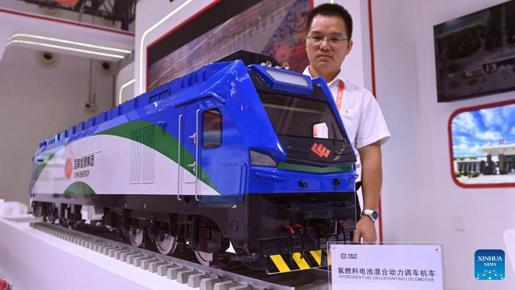 A model of a hydrogen fuel cellshunting locomotive is on display at the 21st China-ASEAN Expo in Nanning, south China's Guangxi Zhuang Autonomous Region, Sept. 26, 2024. New technologies and applications such as intelligent robots, unmanned vehicles and AI applications are gaining popularity at the ongoing China-ASEAN Expo in Nanning. (Xinhua/Zhang Ailin)