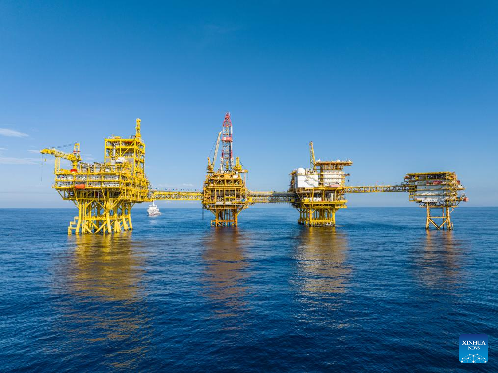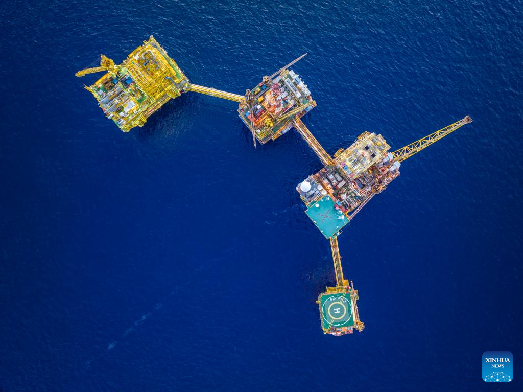This undated aerial drone photo shows the gas production platform cluster of phase II project of China's self-developed ultra-deepwater gas field Shenhai Yihao, or Deep Sea No. 1, located 150 km from the city of Sanya in south China's island province of Hainan. China's first independently-developed ultra-deepwater gas field Shenhai Yihao, or Deep Sea No. 1, has completed construction of its phase II project, which is expected to be operational in the near future, according to the China National Offshore Oil Corporation (CNOOC), its operator. (China National Offshore Oil Corporation (CNOOC)/Handout via Xinhua)