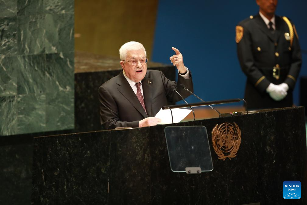 Palestinian President Mahmoud Abbas delivers a speech during the General Debate of the 79th session of the United Nations General Assembly (UNGA) at the UN headquarters in New York, on Sept. 26, 2024. Abbas received a long round of applause as he addressed the United Nations General Assembly (UNGA) on Thursday, insisting that "we will not leave, Palestine is our homeland," and "if anyone were to leave it would be the occupier." (Xinhua/Xie E)
