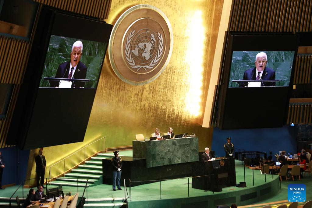 Palestinian President Mahmoud Abbas (at the podium and on the screens) delivers a speech during the General Debate of the 79th session of the United Nations General Assembly (UNGA) at the UN headquarters in New York, on Sept. 26, 2024. Abbas received a long round of applause as he addressed the United Nations General Assembly (UNGA) on Thursday, insisting that "we will not leave, Palestine is our homeland," and "if anyone were to leave it would be the occupier." (Xinhua/Xie E)