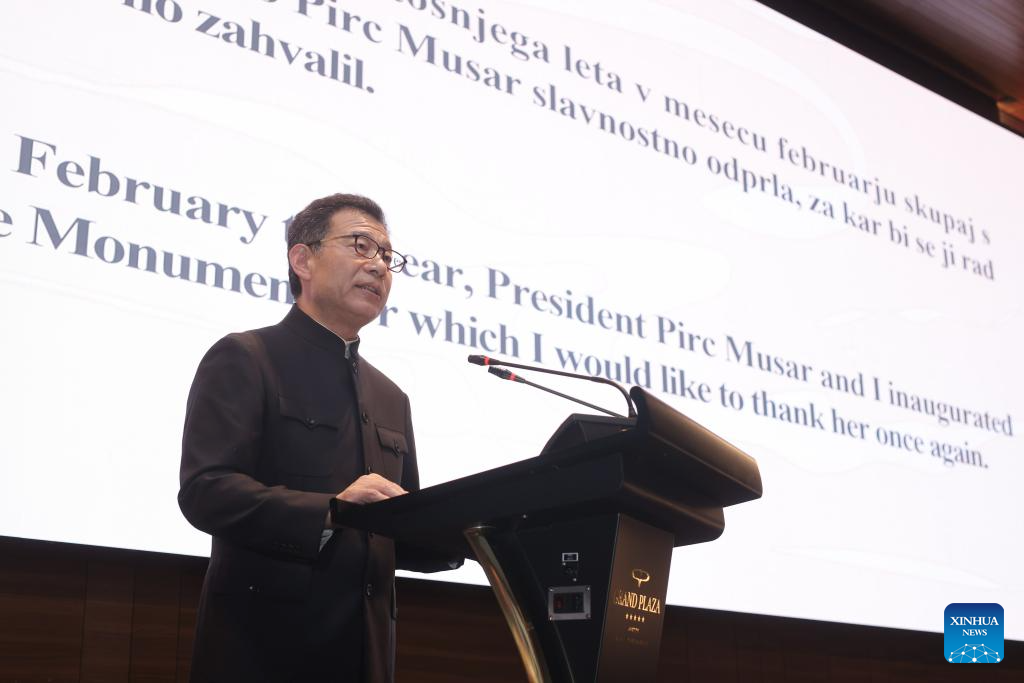 Chinese Ambassador to Slovenia Wang Shunqing speaks at a reception marking the 75th anniversary of the founding of the People's Republic of China in Ljubljana, Slovenia, Sept. 26, 2024. (Photo by Zeljko Stevanic/Xinhua)