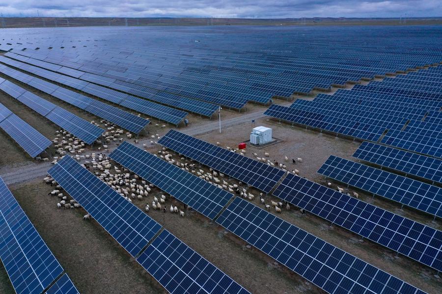 An aerial drone photo taken on June 9, 2022 shows a flock of sheep roaming between solar panels at a solar photovoltaic power plant in Gonghe County, Hainan Tibetan Autonomous Prefecture in northwest China's Qinghai Province. (Xinhua/Zhang Long)