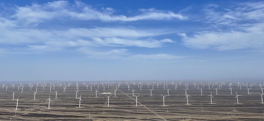 An aerial drone photo taken on Sept. 7, 2024 shows a view of the Santanghu wind power farm in Hami City of northwest China's Xinjiang Uygur Autonomous Region. (Xinhua/Hu Huhu)