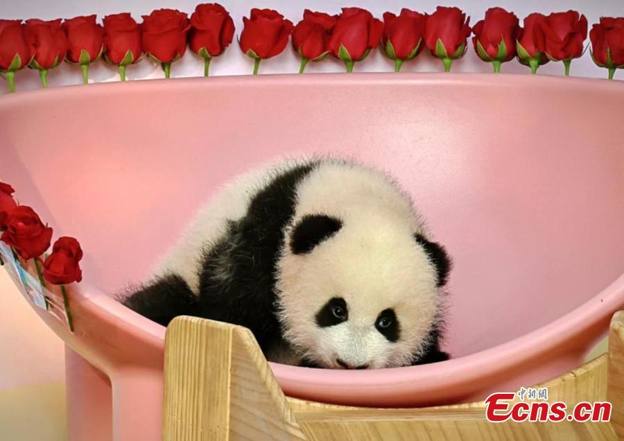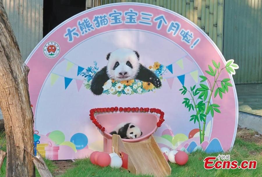 A 3-month-old giant panda cub meets the public at Chongqing Zoo, Sept. 28, 2024. (Photo: China News Service/Zhang Xiufeng)