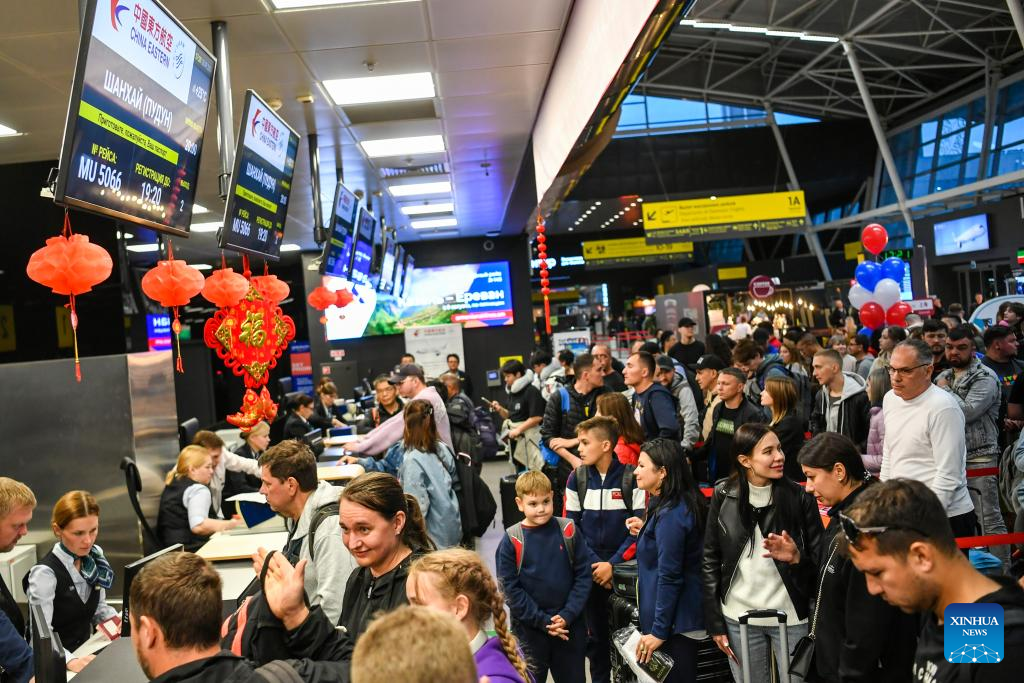 Passengers aboard the first direct flight from China's Shanghai to Kazan operated by China Eastern Airlines, arrive at the airport of Kazan in Kazan, Russia, Sept. 28, 2024. (Xinhua/Cao Yang)