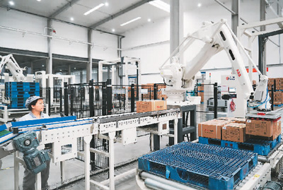 Pet food commodities are being moved by robots in a pet food company in Nanhe district, Xingtai city, north China's Hebei Province. (Photo/Chen Lei)