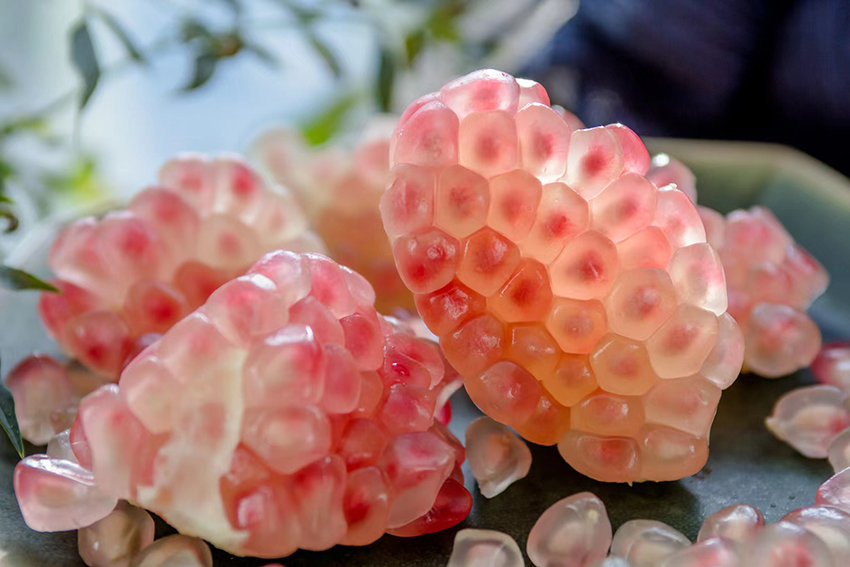 Photo shows seeds of a pomegranate harvested at an ancient pomegranate tree orchard in Mengzi city, southwest China's Yunnan Province. (Photo/People's Daily App)