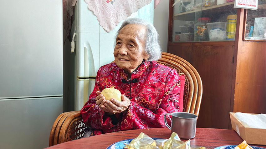 A centenarian holds a pomegranate. (Photo/Chen Huaying)
