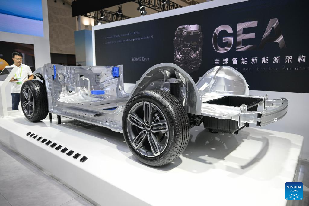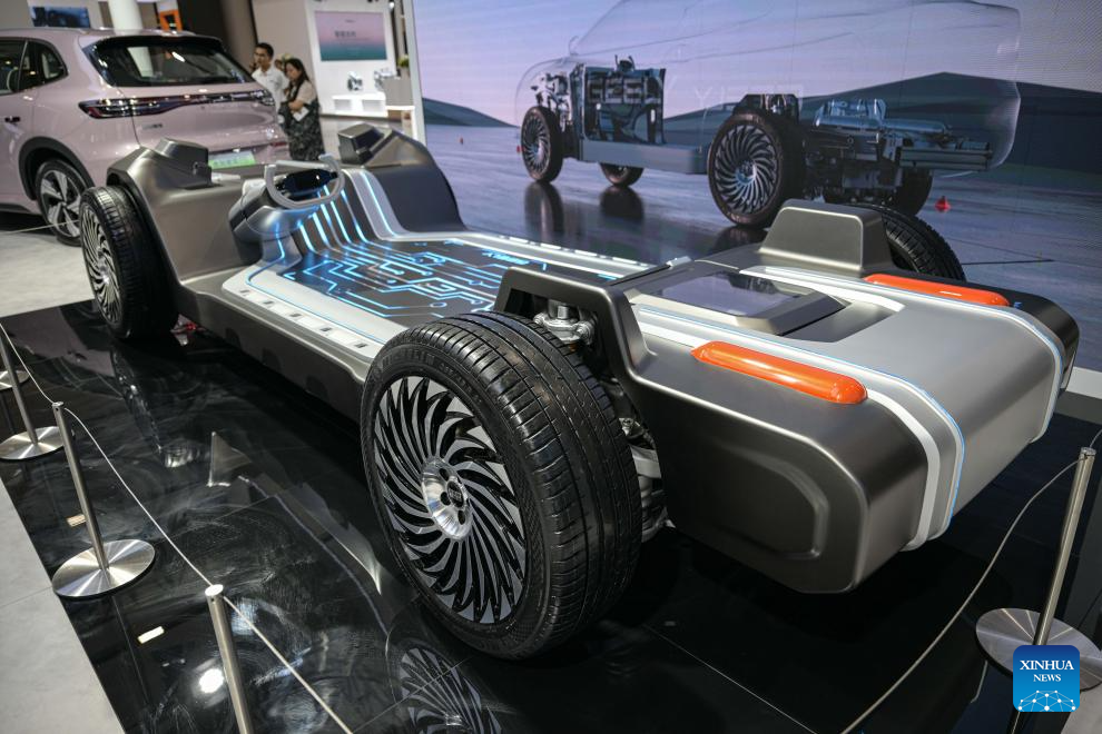 This photo taken on Sept. 28, 2024 shows a Global Intelligent Electric Architecture (GEA) at the booth of Geely during an exhibition featuring cutting-edge technologies and products of new energy vehicle (NEV) in Haikou, south China's Hainan Province, Sept. 28, 2024. More than 30 NEV firms showcased their new energy vehicles, batteries and intelligent-connected technology at the exhibition. (Xinhua/Pu Xiaoxu)