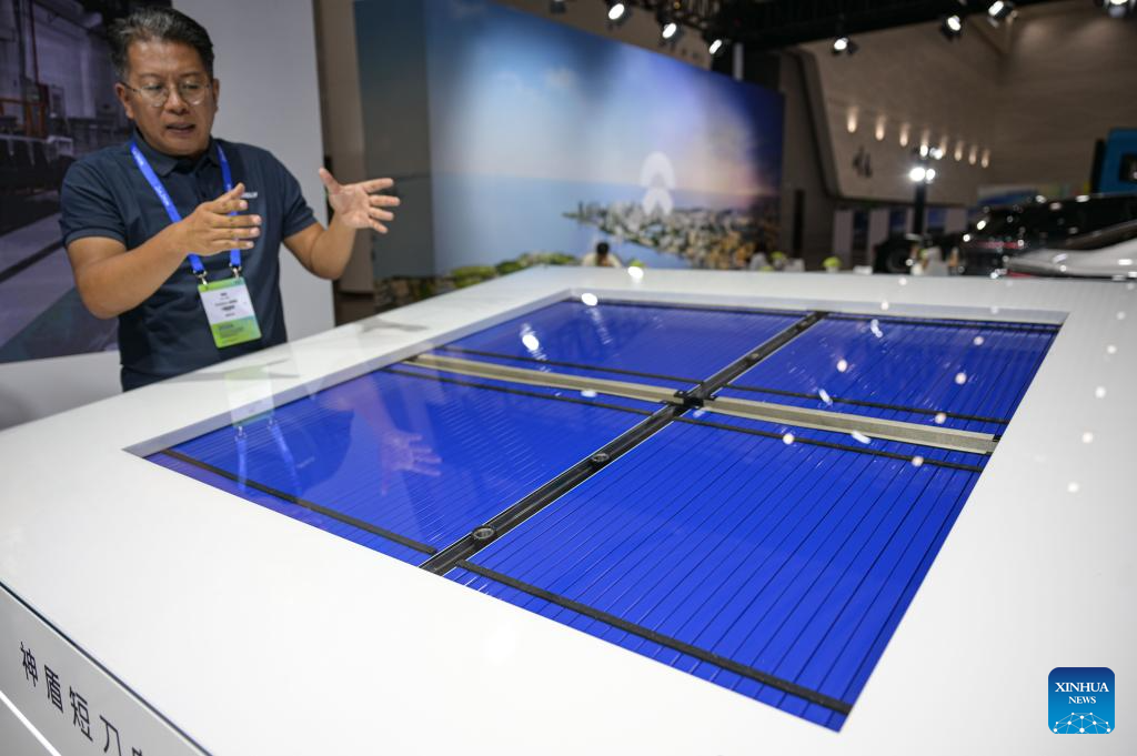 This photo taken on Sept. 28, 2024 shows Shendun short-blade battery at the booth of Geely during an exhibition featuring cutting-edge technologies and products of new energy vehicle (NEV) in Haikou, south China's Hainan Province. More than 30 NEV firms showcased their new energy vehicles, batteries and intelligent-connected technology at the exhibition. (Xinhua/Pu Xiaoxu)