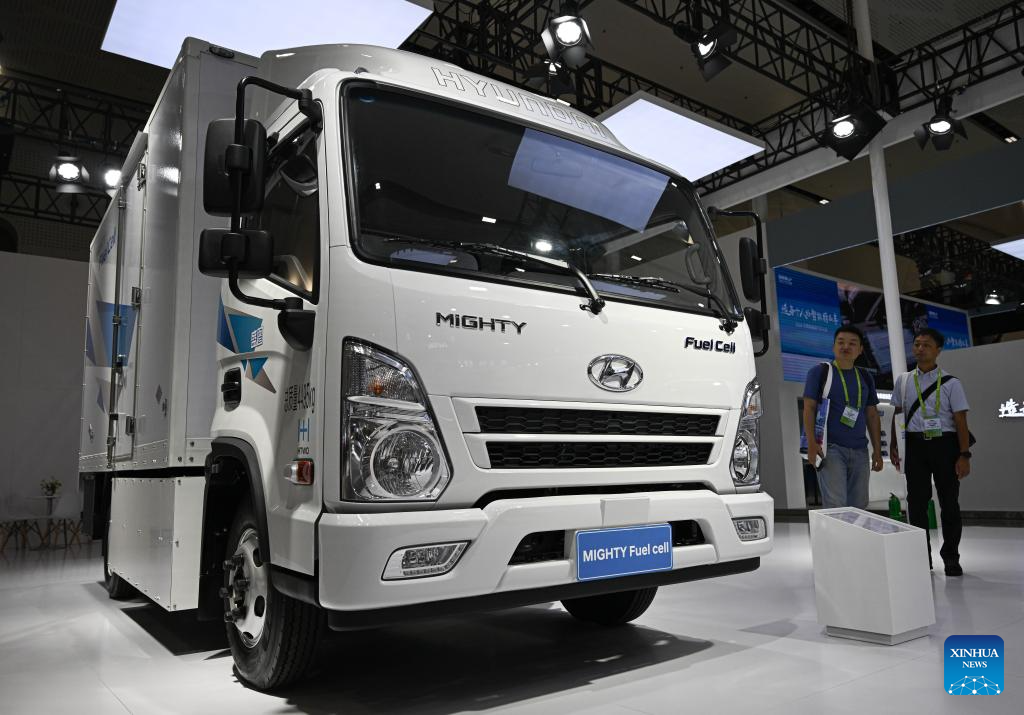 This photo taken on Sept. 28, 2024 shows a MIGHTY Fuel Cell vehicle at the booth of Hyundai during an exhibition featuring cutting-edge technologies and products of new energy vehicle (NEV) in Haikou, south China's Hainan Province. More than 30 NEV firms showcased their new energy vehicles, batteries and intelligent-connected technology at the exhibition. (Xinhua/Pu Xiaoxu)