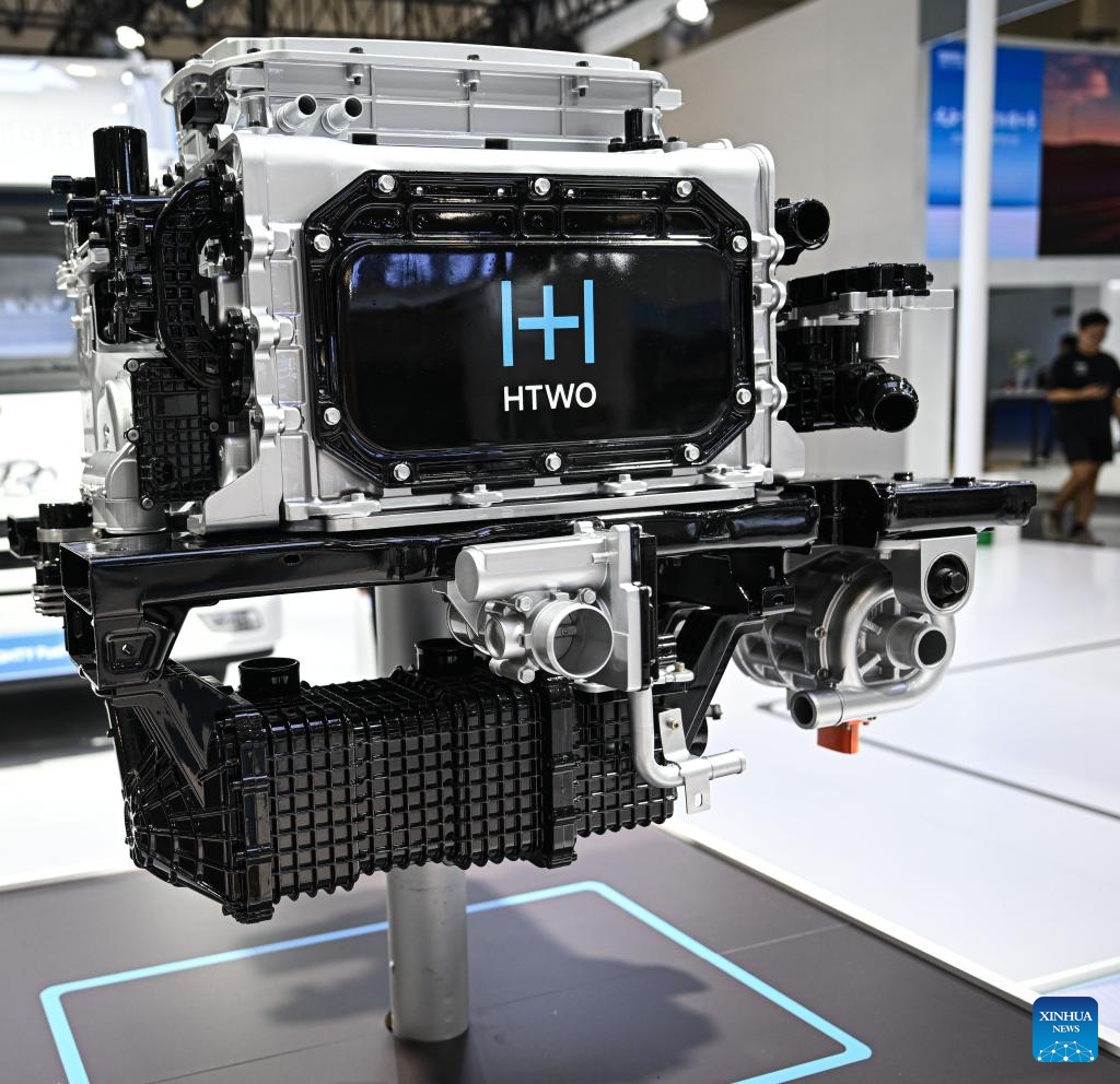This photo taken on Sept. 28, 2024 shows a hydrogen fuel cell system at the booth of Hyundai during an exhibition featuring cutting-edge technologies and products of new energy vehicle (NEV) in Haikou, south China's Hainan Province. More than 30 NEV firms showcased their new energy vehicles, batteries and intelligent-connected technology at the exhibition. (Xinhua/Pu Xiaoxu)