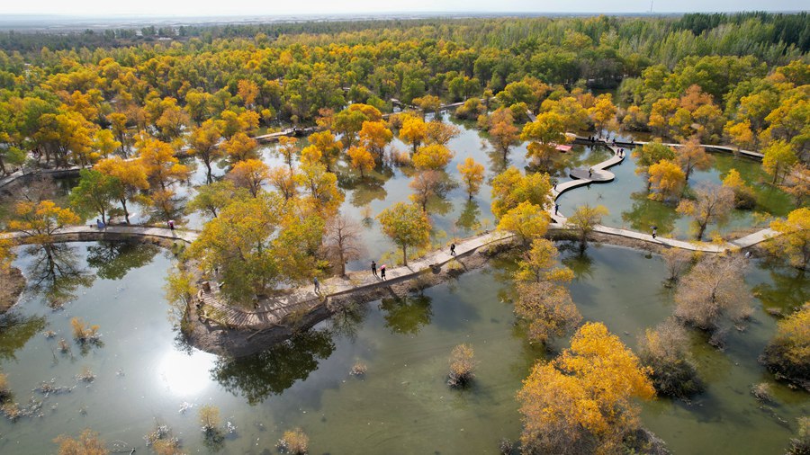 Photo taken on Sept. 27, 2024, shows a breathtaking autumn view of a vast desert poplar forest covering an area of more than 10,000 mu (about 666.67 hectares) in the Jinta desert poplar forest scenic area of Jiuquan city, northwest China's Gansu Province. (Photo/Cao Hongzu).