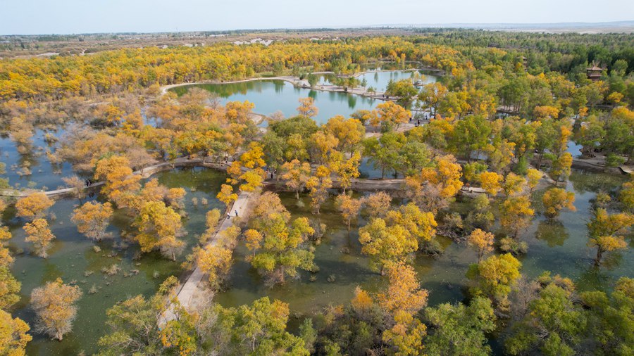 Photo taken on Sept. 27, 2024, shows a breathtaking autumn view of a vast desert poplar forest covering an area of more than 10,000 mu (about 666.67 hectares) in the Jinta desert poplar forest scenic area of Jiuquan city, northwest China's Gansu Province. (Photo/Cao Hongzu).
