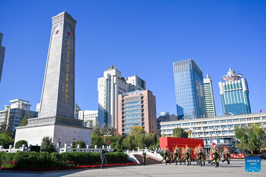 A mourning ritual is held at the People's Square in Urumqi, northwest China's Xinjiang Uygur Autonomous Region, Sept. 30, 2024. The event was held to mark China's 11th Martyrs' Day, a day ahead of its National Day. (Xinhua/Chen Shuo)