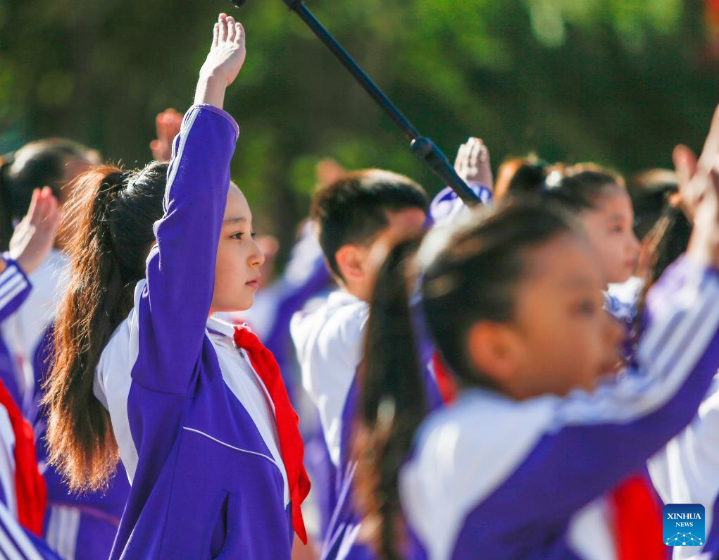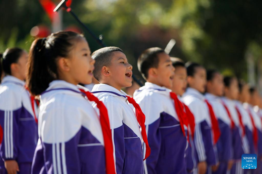 Members of the Chinese Young Pioneers sing during a mourning ritual at the People's Square in Urumqi, northwest China's Xinjiang Uygur Autonomous Region, Sept. 30, 2024. The event was held to mark China's 11th Martyrs' Day, a day ahead of its National Day. (Xinhua/Chen Shuo)