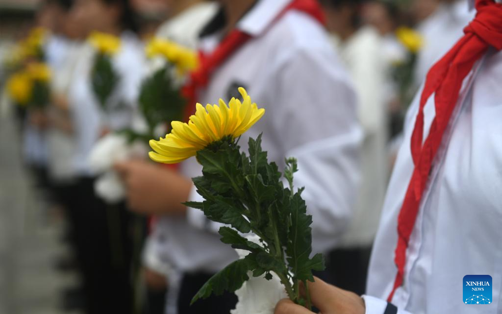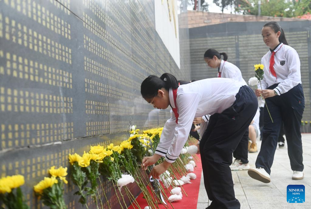 Members of the Chinese Young Pioneers lay flowers to pay tribute to fallen heroes at a martyrs' cemetery in Nanning, south China's Guangxi Zhuang Autonomous Region, Sept. 30, 2024. The event was held to mark China's 11th Martyrs' Day, a day ahead of its National Day. (Xinhua/Lu Boan)
