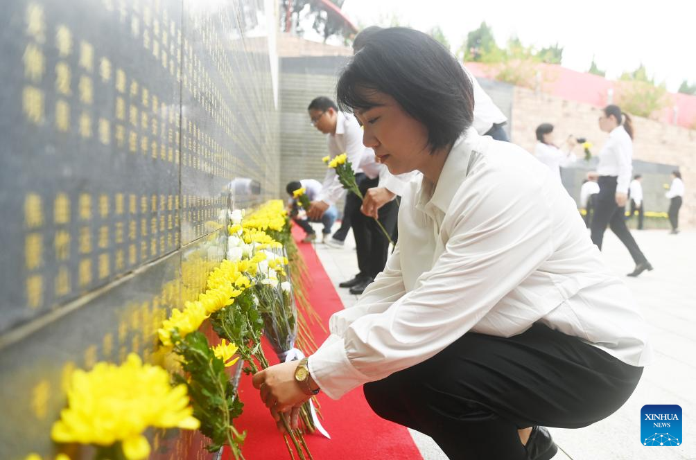 People lay flowers to pay tribute to fallen heroes at a martyrs' cemetery in Nanning, south China's Guangxi Zhuang Autonomous Region, Sept. 30, 2024. The event was held to mark China's 11th Martyrs' Day, a day ahead of its National Day. (Xinhua/Lu Boan)