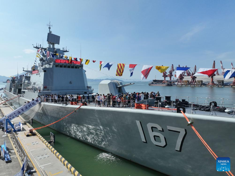 This aerial drone photo shows visitors on the naval vessel Shenzhen during an open day activity at a port in Shenzhen of south China's Guangdong Province, Oct. 1, 2024. (Photo by Ji Xiang/Xinhua)