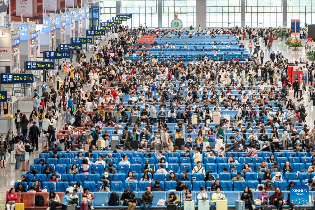 Passengers are seen at a waiting hall of Guiyang North Railway Station in Guiyang, southwest China's Guizhou Province, Oct. 1, 2024. Tuesday marks the first day of China's National Day holiday. China is expected to see 175 million railway trips during the 10-day travel rush, which runs from Sept. 29 to Oct. 8, according to China State Railway Group Co., Ltd. (Photo by Long Jianrui/Xinhua)