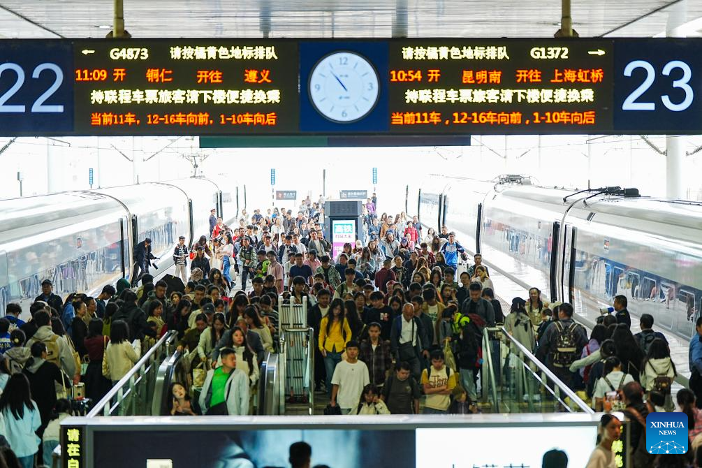 Passengers get off trains at Guiyang North Railway Station in Guiyang, southwest China's Guizhou Province, Oct. 1, 2024. Tuesday marks the first day of China's National Day holiday. China is expected to see 175 million railway trips during the 10-day travel rush, which runs from Sept. 29 to Oct. 8, according to China State Railway Group Co., Ltd. (Xinhua/Liu Xu)