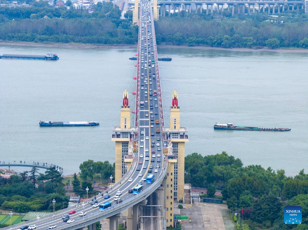 An aerial drone photo taken on Oct. 1, 2024 shows the traffic on the Nanjing Yangtze River Bridge in Nanjing, east China's Jiangsu Province. Tuesday marks the first day of China's National Day holiday. China is expected to see 175 million railway trips during the 10-day travel rush, which runs from Sept. 29 to Oct. 8, according to China State Railway Group Co., Ltd. (Photo by Yang Suping/Xinhua)