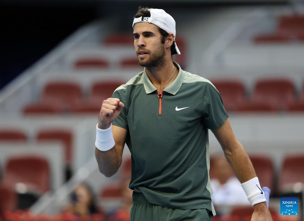 Karen Khachanov of Russia celebrates scoring during the men's singles quarterfinals against Carlos Alcaraz of Spain at 2024 China Open tennis tournament in Beijing, capital of China, Sept. 30, 2024. (Xinhua/Zhang Chenlin)