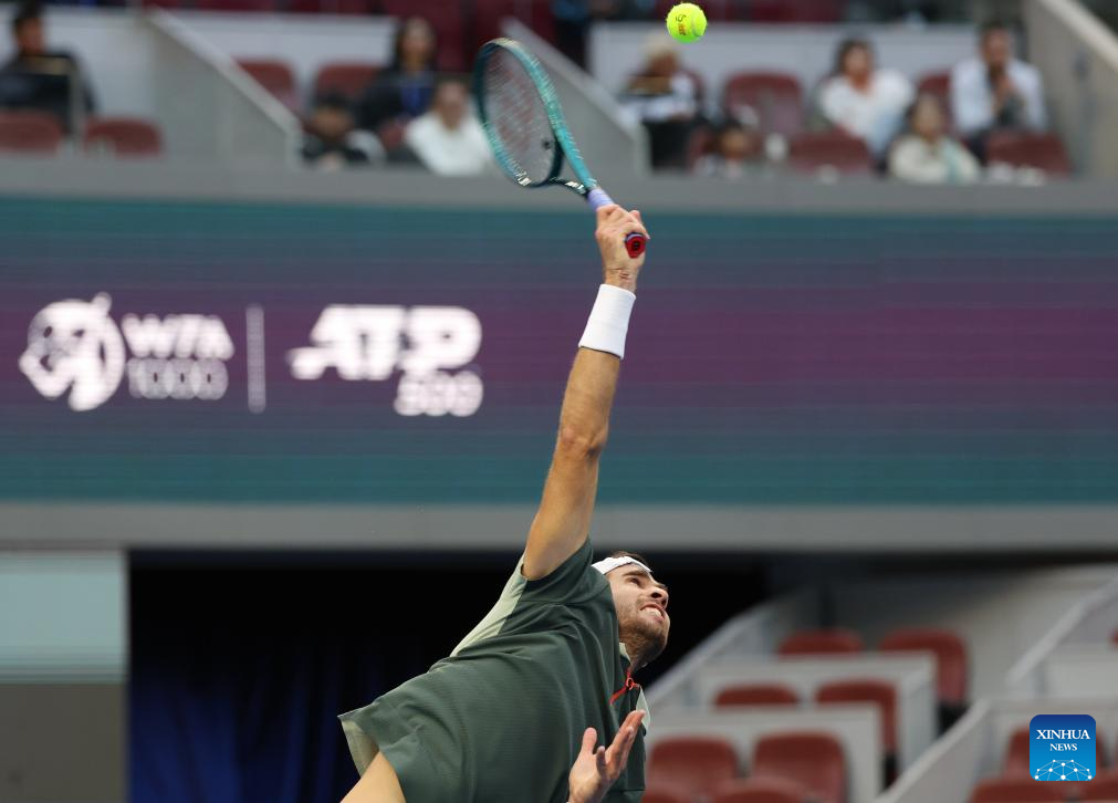 Karen Khachanov of Russia serves during the men's singles quarterfinals against Carlos Alcaraz of Spain at 2024 China Open tennis tournament in Beijing, capital of China, Sept. 30, 2024. (Xinhua/Zhang Chenlin)