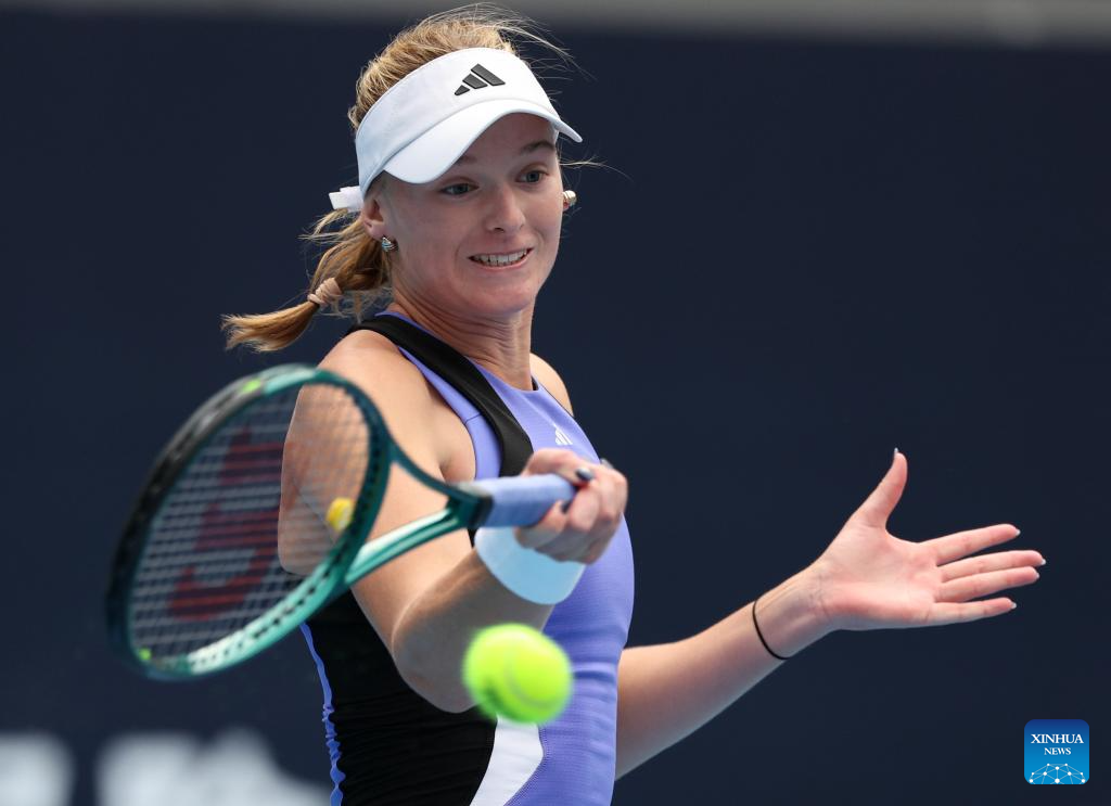 Ashlyn Krueger of the United States hits a return during the women's singles third round match against Aryna Sabalenka of Belarus at 2024 China Open tennis tournament in Beijing, capital of China, Sept. 30, 2024. (Xinhua/Zhang Chenlin)