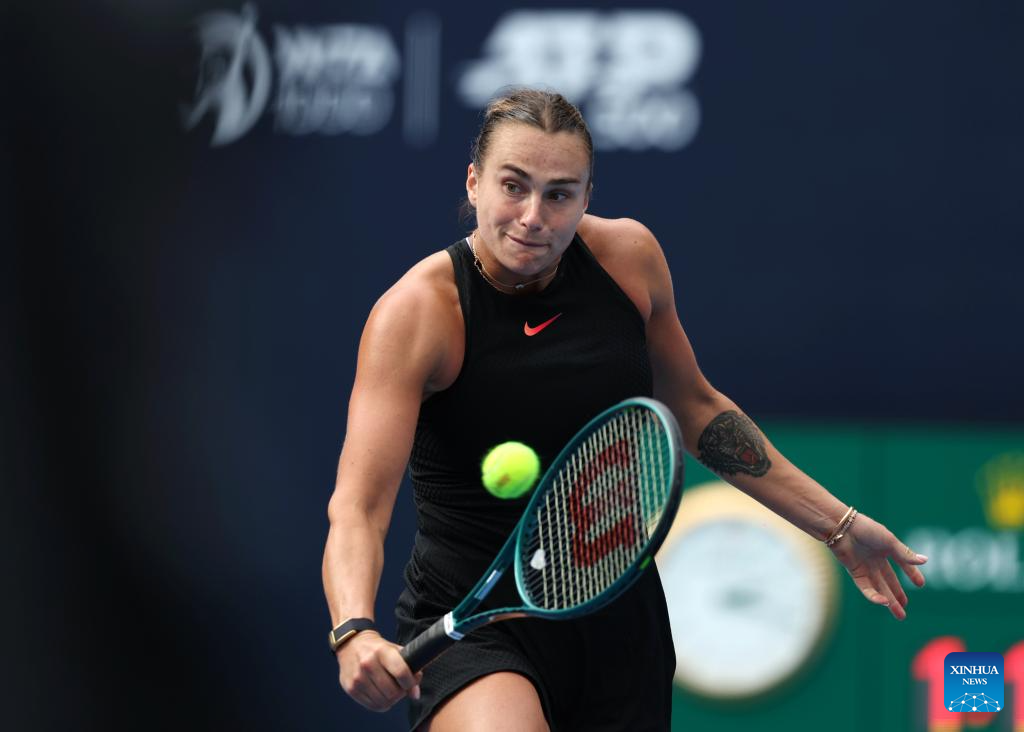 Aryna Sabalenka of Belarus hits a return during the women's singles third round match against Ashlyn Krueger of the United States at 2024 China Open tennis tournament in Beijing, capital of China, Sept. 30, 2024. (Xinhua/Zhang Chenlin)