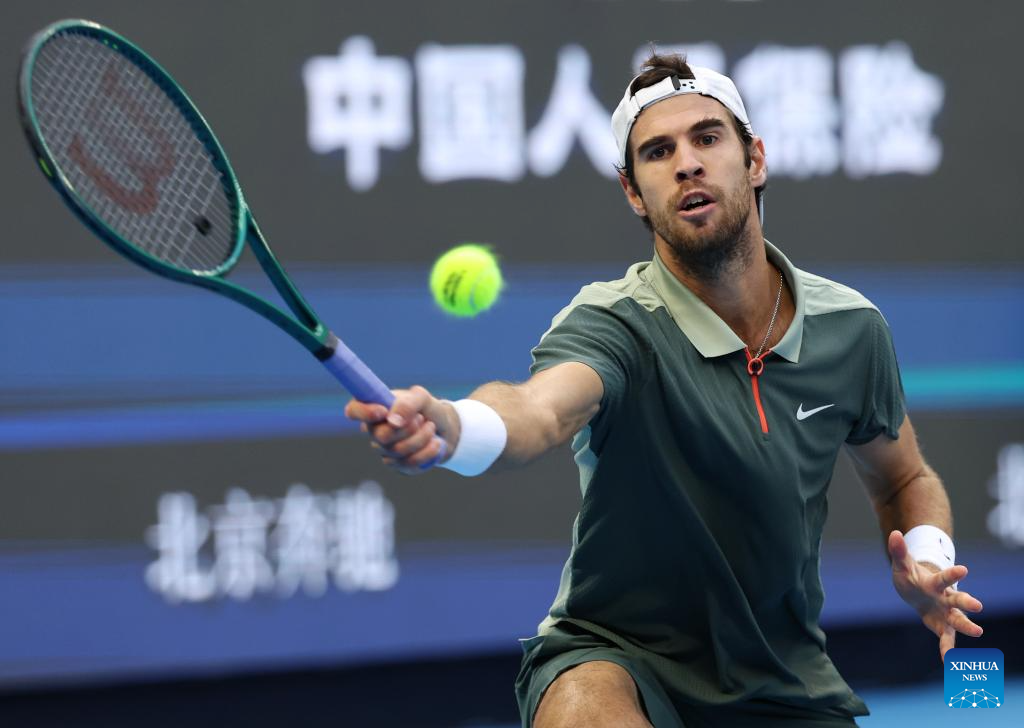 Karen Khachanov of Russia competes during the men's singles quarterfinals against Carlos Alcaraz of Spain at 2024 China Open tennis tournament in Beijing, capital of China, Sept. 30, 2024. (Xinhua/Zhang Chenlin)