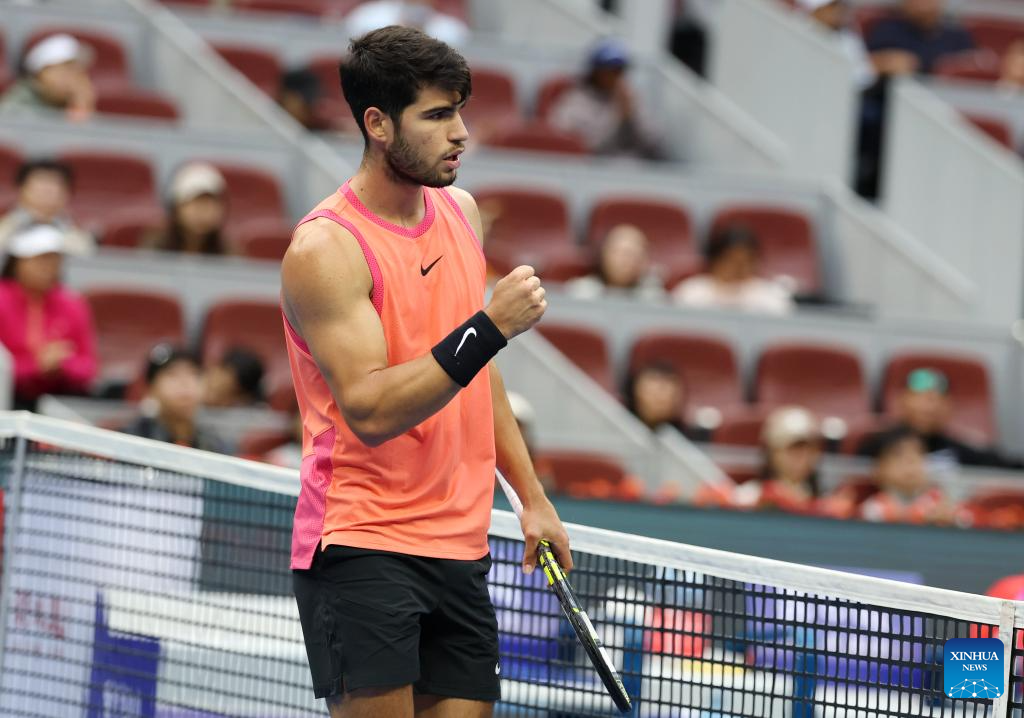 Carlos Alcaraz of Spain competes during the men's singles quarterfinals against Karen Khachanov of Russia at 2024 China Open tennis tournament in Beijing, capital of China, Sept. 30, 2024. (Xinhua/Zhang Chenlin)
