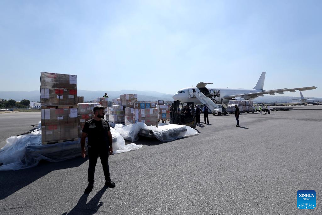 Aid provided by the World Health Organization (WHO) and the United Nations High Commissioner for Refugees (UNHCR) is unloaded at an airport in Beirut, Lebanon, on Oct. 4, 2024. An aid plane carrying 55 tons of aid and medical supplies arrived Friday in Lebanon from the United Arab Emirates, the National News Agency (NNA) reported. This aid was provided by the World Health Organization (WHO) and the United Nations High Commissioner for Refugees (UNHCR), said the report. (Xinhua/Bilal Jawich)
