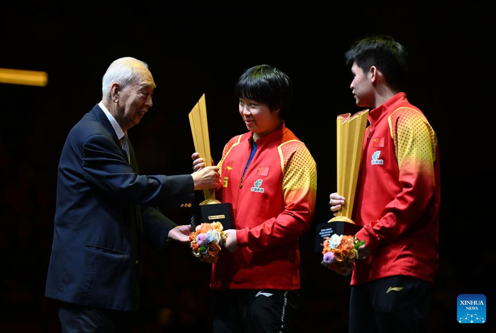 Liu Guoliang, president of Chinese Table Tennis Association (CTTA), gives the trophies to Lin Gaoyuan (R)/Wang Yidi during the awarding ceremony after the mixed doubles final between Lin Shidong/Kuai Man of China and their teammates Lin Gaoyuan/Wang Yidi at 2024 World Table Tennis (WTT) China Smash in Beijing, China, Oct. 4, 2024. (Xinhua/Xiao Yijiu)