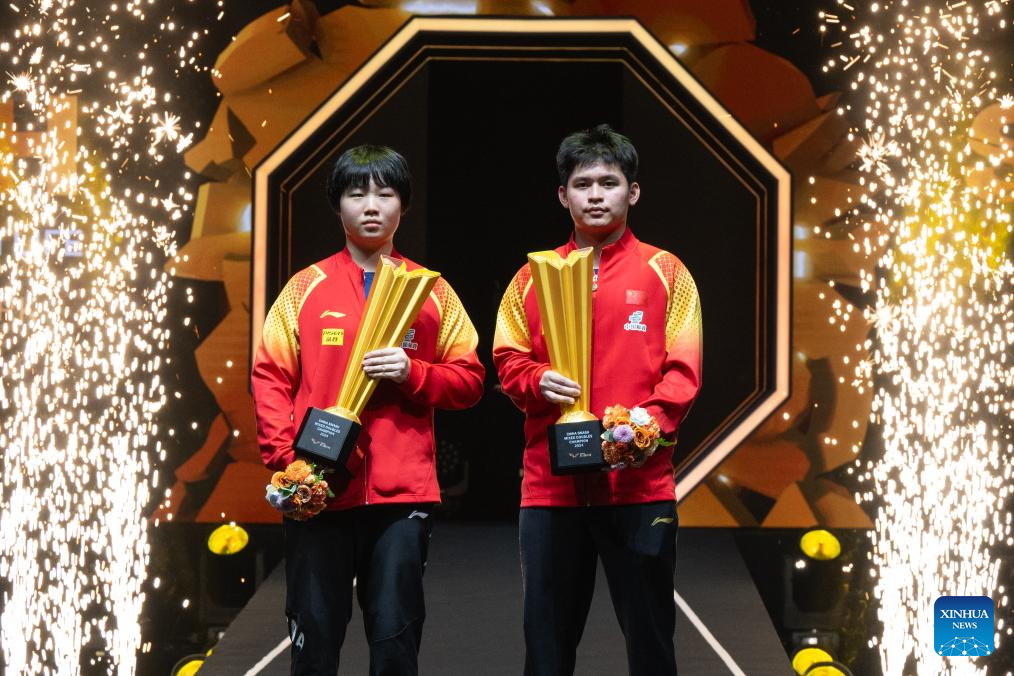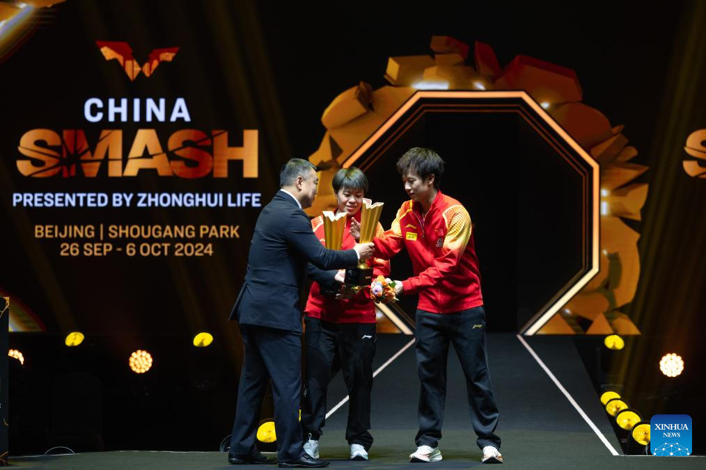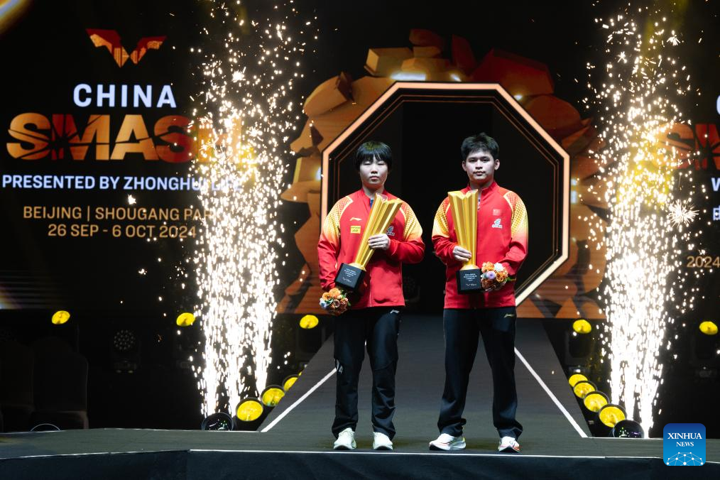 Lin Shidong (R)/Kuai Man hold their trophies during the awarding ceremony after the mixed doubles final between Lin Shidong/Kuai Man of China and their teammates Lin Gaoyuan/Wang Yidi at 2024 World Table Tennis (WTT) China Smash in Beijing, China, Oct. 4, 2024. (Xinhua/Xiao Yijiu)
