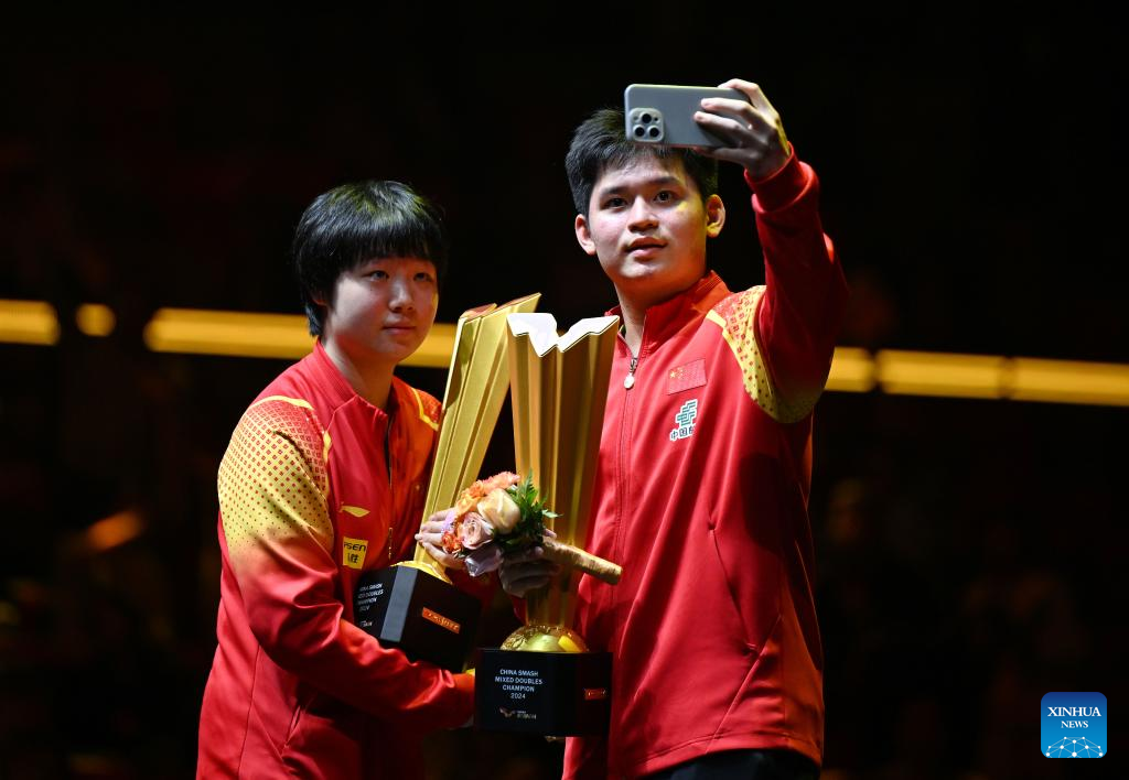 Lin Shidong (R)/Kuai Man take a selfie during the awarding ceremony after the mixed doubles final between Lin Shidong/Kuai Man of China and their teammates Lin Gaoyuan/Wang Yidi at 2024 World Table Tennis (WTT) China Smash in Beijing, China, Oct. 4, 2024. (Xinhua/Xiao Yijiu)