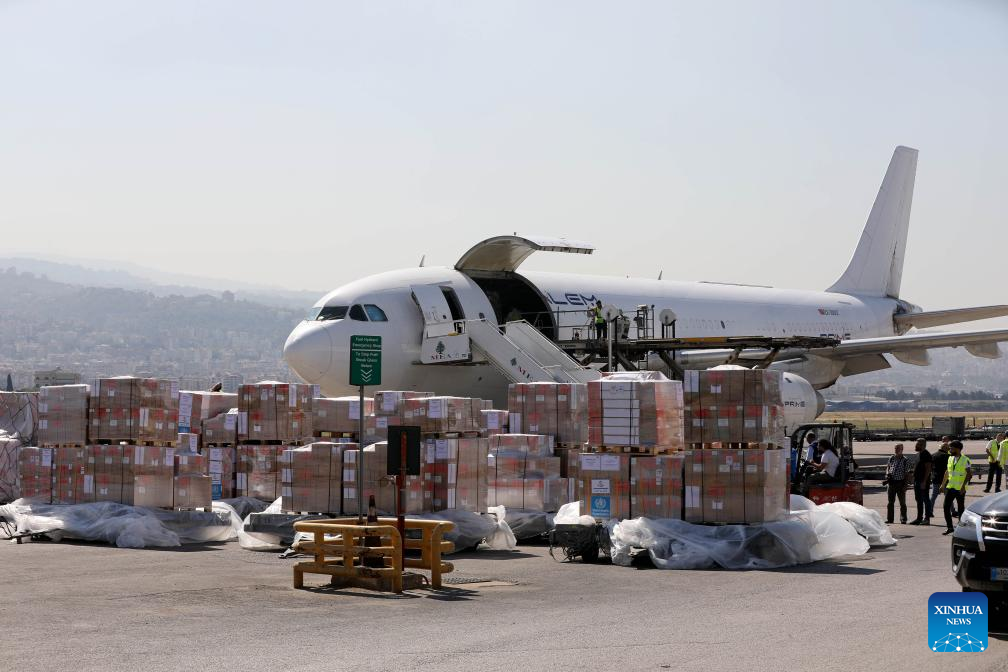 Aid provided by the World Health Organization (WHO) and the United Nations High Commissioner for Refugees (UNHCR) is unloaded at an airport in Beirut, Lebanon, on Oct. 4, 2024. An aid plane carrying 55 tons of aid and medical supplies arrived Friday in Lebanon from the United Arab Emirates, the National News Agency (NNA) reported. This aid was provided by the World Health Organization (WHO) and the United Nations High Commissioner for Refugees (UNHCR), said the report. (Xinhua/Bilal Jawich)