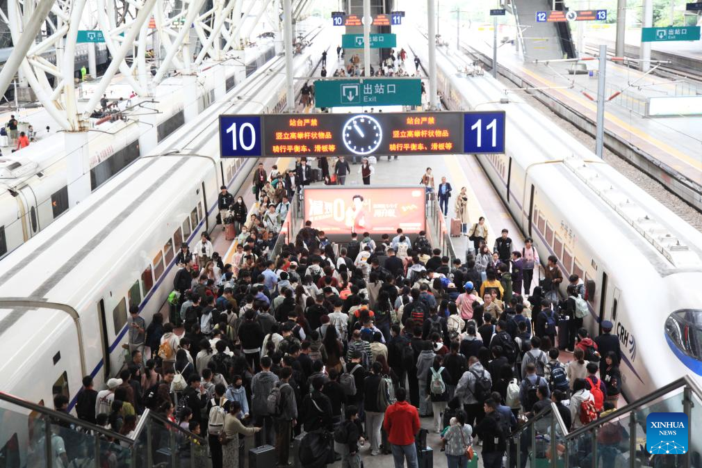 Passengers wait to board a train at the platform at Hengyang East Railway Station in Hengyang City, central China's Hunan Province, Oct. 6, 2024. China sees a surge in return trips on Sunday as the week-long National Day holiday draws to a close. (Photo by Cao Zhengping/Xinhua)