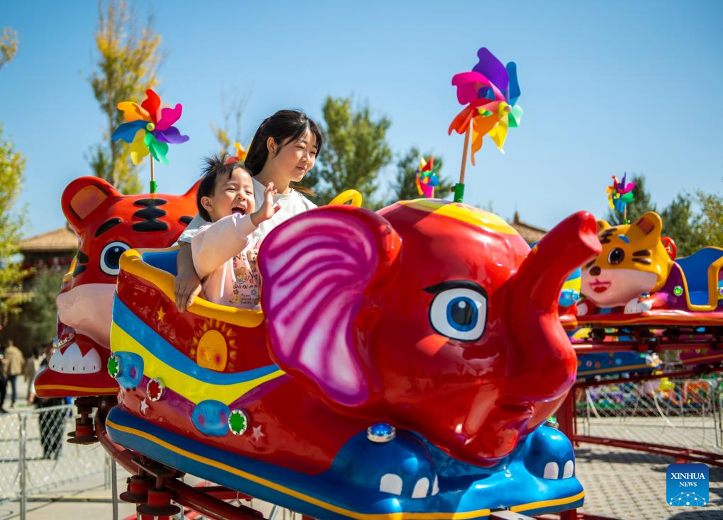 People have fun at a scenic spot in Jiuquan, northwest China's Gansu Province, Oct. 4, 2024. During the week-long National Day holiday starting on Oct. 1, Chinese people take a break to travel and enjoy leisure activities. Travel and holiday consumption have continued to boom, mirroring the vitality of Chinese economy. (Photo by Gao Hongshan/Xinhua)