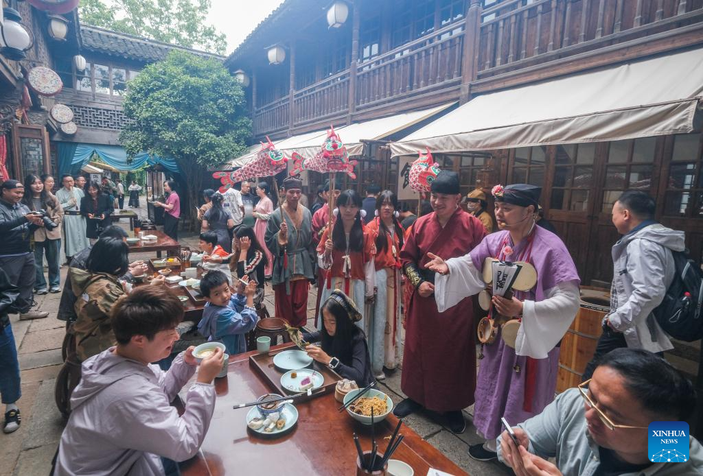 Staff members in traditional costumes interact with visitors at the Puyuan Fashion Resort in Puyuan Town of Tongxiang City, east China's Zhejiang Province, Oct. 5, 2024. During the week-long National Day holiday starting on Oct. 1, Chinese people take a break to travel and enjoy leisure activities. Travel and holiday consumption have continued to boom, mirroring the vitality of Chinese economy. (Xinhua/Xu Yu)