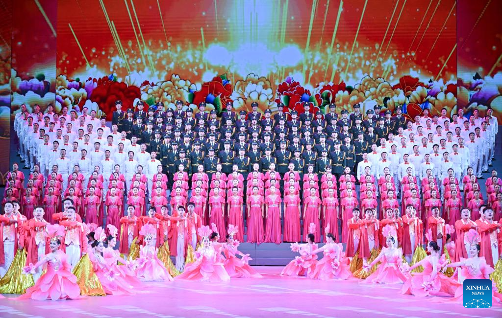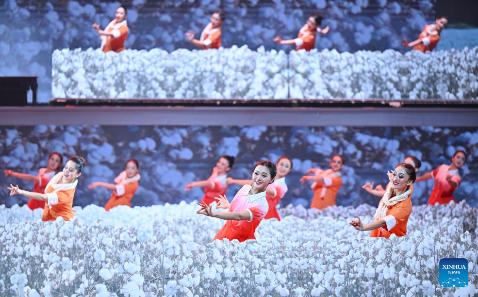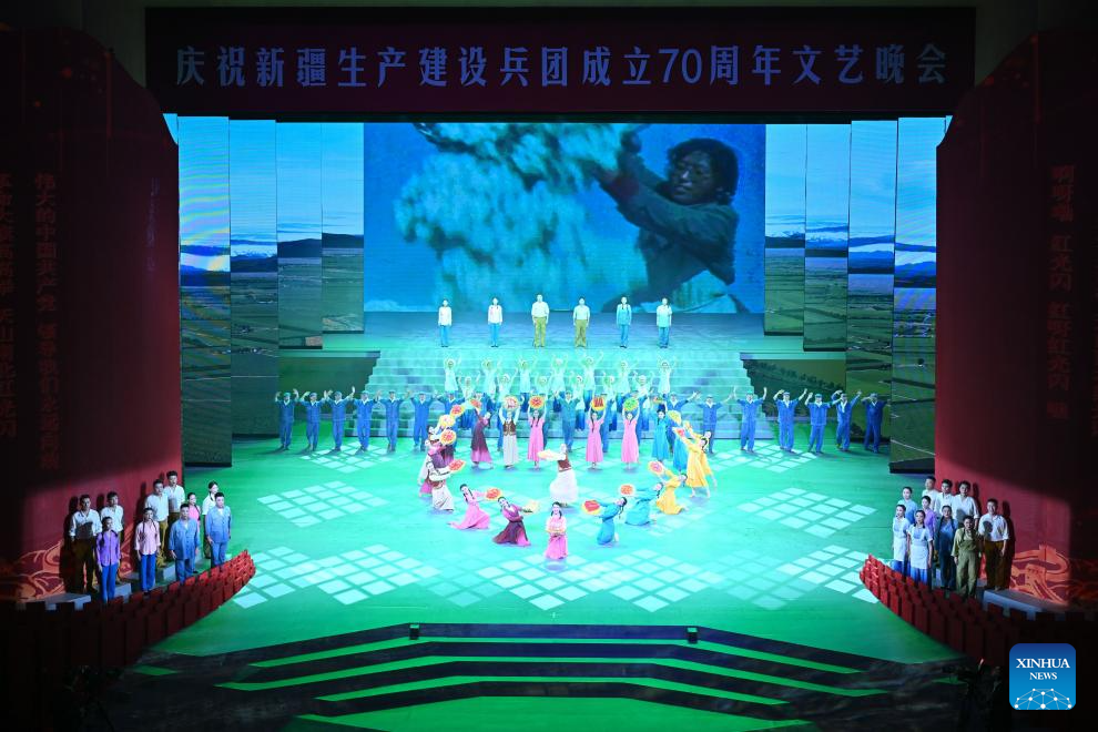 An artistic performance is staged to celebrate the 70th founding anniversary of the Xinjiang Production and Construction Corps in Urumqi, capital of northwest China's Xinjiang Uygur Autonomous Region, Oct. 6, 2024. (Xinhua/Li Xiang)