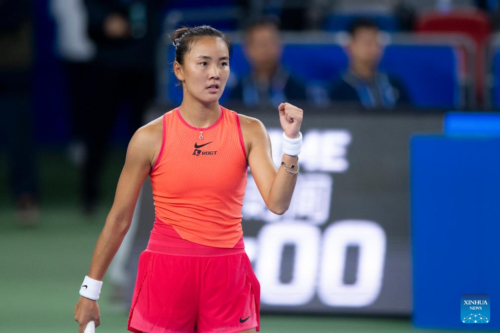 Yuan Yue of China celebrates a score during the women's singles round of 64 match against Clara Burel of France at the 2024 Wuhan Open tennis tournament in Wuhan, capital of central China's Hubei Province, Oct. 7, 2024. (Xinhua/Wu Zhizun)