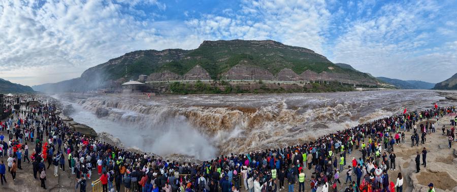 An aerial panoramic drone photo taken on Oct. 4, 2024 shows tourists visiting the Hukou Waterfall on the Yellow River, on the border area between north China's Shanxi and northwest China's Shaanxi provinces. (Xinhua/Chen Yehua)