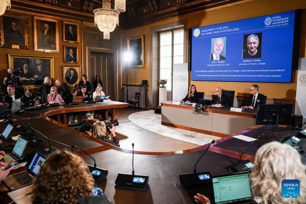 The 2024 Nobel Prize in Physics is announced in Stockholm, Sweden, Oct. 8, 2024. The 2024 Nobel Prize in Physics went to two scientists, John J. Hopfield and Geoffrey E. Hinton, for foundational discoveries and inventions that enable machine learning with artificial neural networks, the Royal Swedish Academy of Sciences said on Tuesday. (Xinhua/Peng Ziyang)